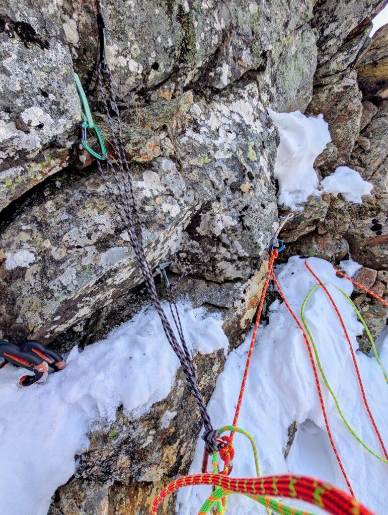 Nach sieben Seillängen stehen wir dann an einem Grätchen, von dem aus man in leichtem Gelände weiter zum Grieskogel aufsteigen könnte. Als eingefleischte Sportkletterer – immerhin war Dani mal bayrischer Jugendmeister – ziehen wir aber die Option des reibungsbasierten Rückwegs vor. Um diesen durchführen zu können (und in weiser Vorraussicht für Wiederholende) haben wir eine lithiumbetriebene Rückwegswegbereitungsmaschine und dreizehn edelstahlbasierte Verankerungshilfen im Rucksack.