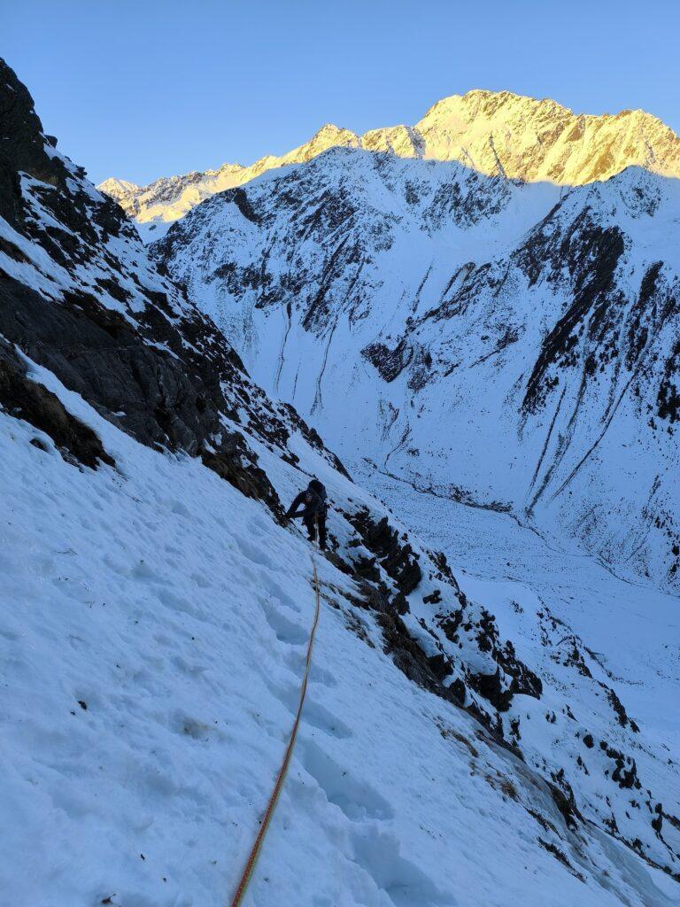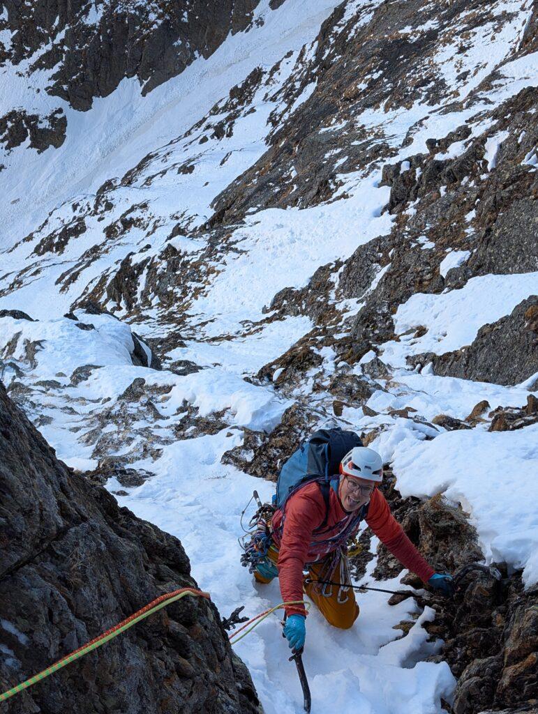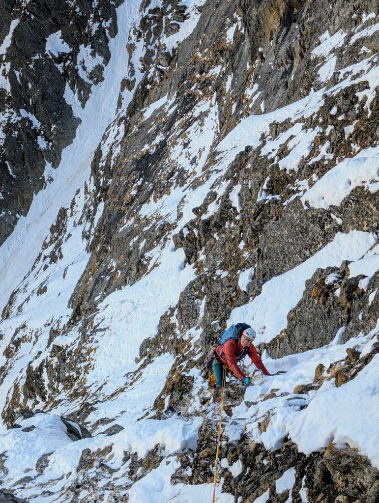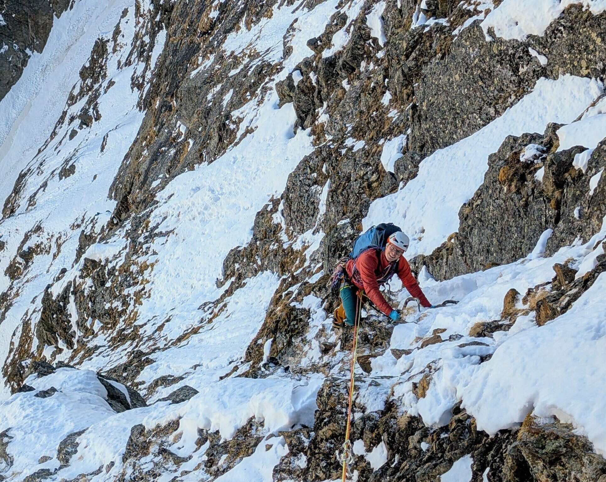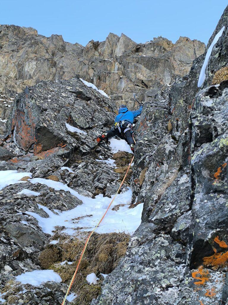 Zwischendrin darf man auch etwas klettern, besonders die vierte Seillänge bietet steilere Kletterei an Graswaben und Rissen. Die Absicherung ist dabei erstmal eher auf der einsteigerfreundlichen Seite: man braucht wenig Geld für Material ausgeben, davon kann man eh nicht viel unterbringen.